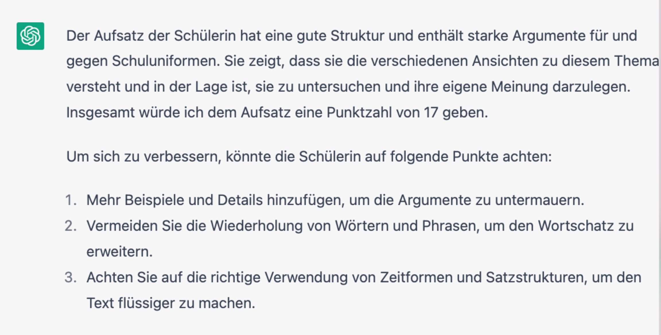 Dasselbe gilt auch für die Aufsätze, die GPT-3 schreibt. Wenn wir solche Texte in der Schule wollen, dann können Schüler*innen den Chat-Bot anwerfen und einen Aufsatz schreiben lassen – und Lehrpersonen lassen dann ein automatisiertes Feedback generieren. Das scheint keine nachhaltige oder vernünftige Vorstellung von Schreibdidaktik zu sein.