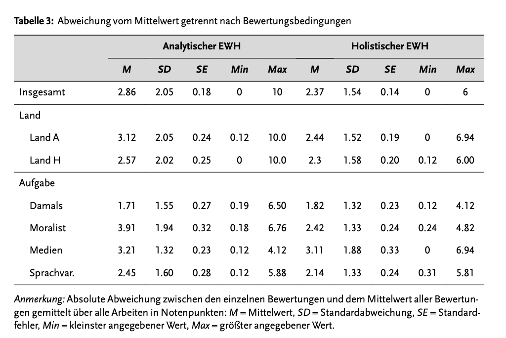 Die Untersuchungen zeigen eine enorme Varianz von Bewertungen. Diese Unterschiedlichkeit hat nichts damit zu tun, ob ein genaues Kriterienraster vorliegt oder nicht, wie folgende Tabelle zeigt. Bei der Aufgabe »Damals« weichen die Korrigierenden im Mittel 1.71 Notenpunkte vom Mittelwert ab (maximal gibt es 15 Notenpunkte), wenn sie ein Raster verwenden – ohne Raster sind es 1.82. Bei der Aufgabe »Sprachvariation« beträgt die durchschnittliche Abweichung 2.45 mit Raster und 2.14 ohne.