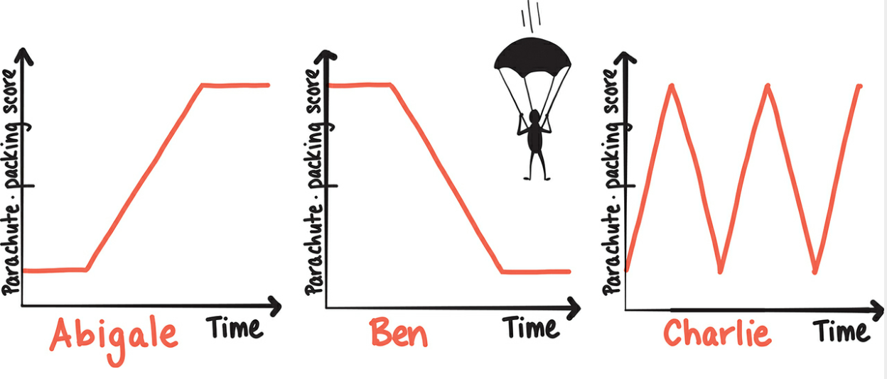 Als Gedankenexperiment stellt Liljedahl drei Angestelle in einem Shop vor, der Fallschirme vermietet. Die Graphen zeigen, wie gut die Ergebnisse bei Prüfungen sind, in denen Abigale, Ben und Charlie Fallschirme packen müssen. Zum aktuellen Zeitpunkt (ganz rechts), kann Abigale den Fallschirm wohl am besten packen. Bei Ben ist eine Krise eingetreten, er ist verunsichert. Charlies Kompetenz schwankt, sie wird offenbar von einem anderen Faktor beeinflusst, z.B. durch Müdigkeit.