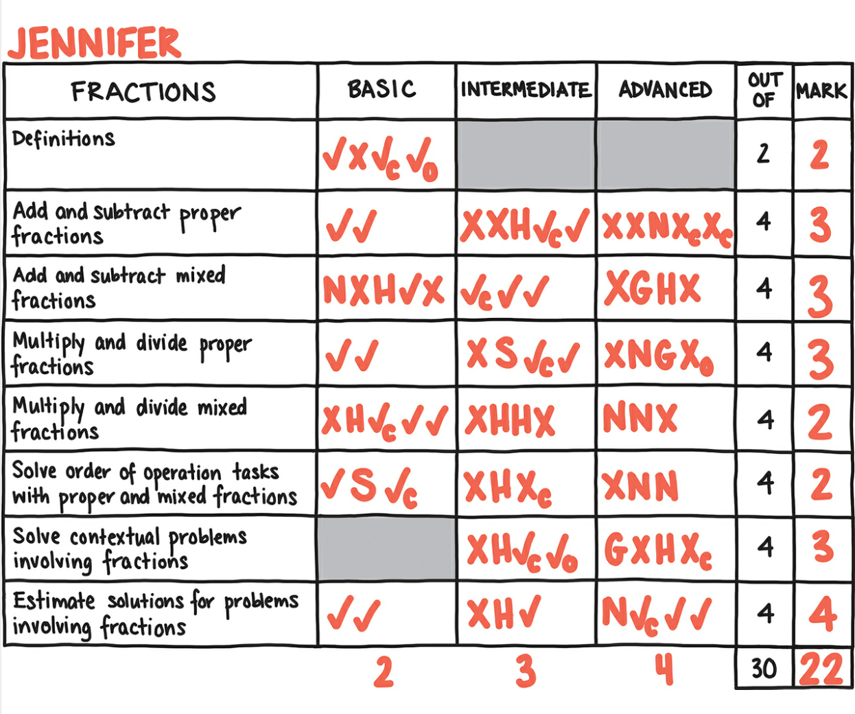 N Versuch des Nachweis wurde nicht unternommen - Zwei aufeinanderfolgende Nachweise zeigen, dass eine Kompetenz vorhanden ist. (Im unteren Beispiel ist das z.B. bei »Add and subtract« bei »Basic« und »Intermediate« der Fall, bei »Advanced« jedoch nicht.)