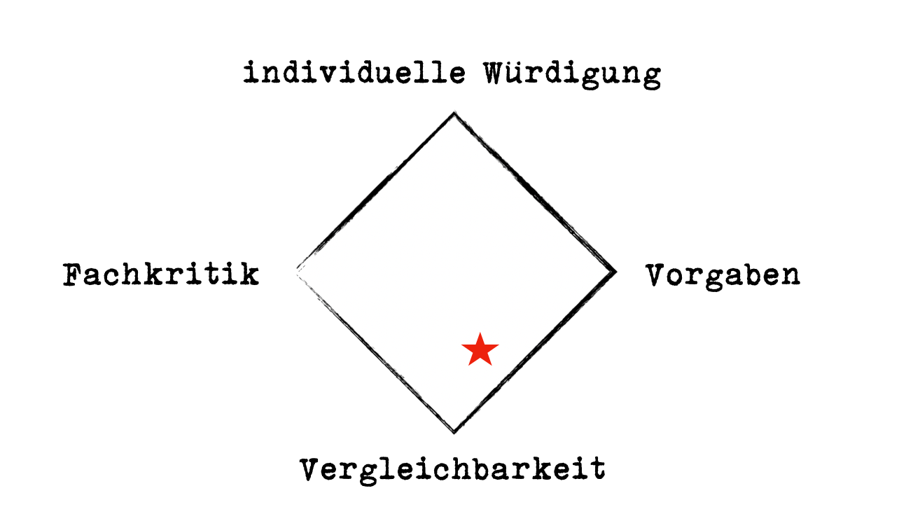 Bewertungen sind immer eine Mischung aus Wertschätzung/Würdigung einer Leistung, einem Abgleich mit Vorgaben, eine Fachkritik und ein Instrument zum Vergleich. Wenn jetzt ein Schüler einen lokalen Führer für Fastfood-Stände gestaltet, dann ist der vielleicht originell und humorvoll – was eine Bewertung würdigen sollte. Gleichzeitig ignoriert dieser Schüler vielleicht bestimmte Vorgaben. Seinen Führer könnte man so niemals drucken oder publizieren, weil er fehlerhaft ist und ein viel zu kleines Zielpublikum anspricht. Und seine Arbeit ist etwas besser als andere und etwas schlechter als andere. Was für eine Note soll er erhalten?