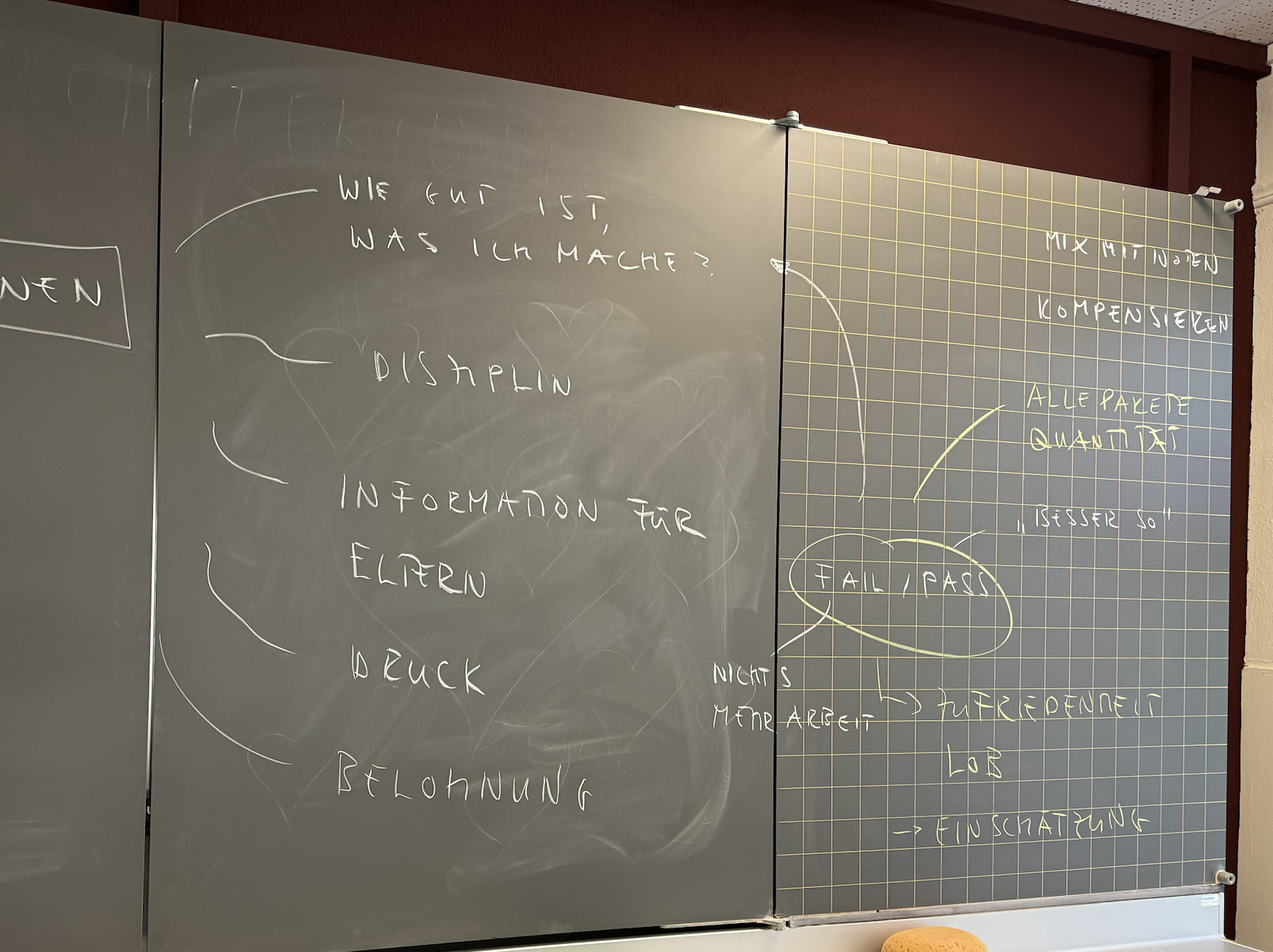 Dieses Denken führt dazu, dass es in der Schule eine Art Belohnungsystem braucht, um sichtbar zu machen, was eine 'Leistung' ist. Noten erfüllen diese Voraussetzungen, obwohl sie das nicht tun sollten. Sie schaffen eine problematische Unterscheidung und würdigen Fähigkeiten und Einsatz nach willkürlichen Kriterien.