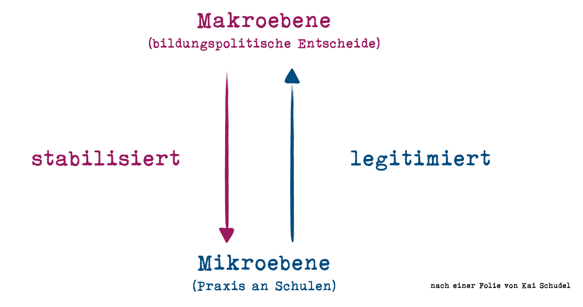 Dabei ist mir in der Diskussion und in der theoretischen Rahmung durch Kai Schudel ein Zusammenhang bewusst geworden, den ich in dieser Deutlichkeit noch nicht fassen konnte. Dabei geht es um das Verhältnis von bildungspolitischen Entscheidungen (durch Schulleitungen, Ämter, Gesetzgebende etc.) zur alltäglichen Praxis an Schulen.