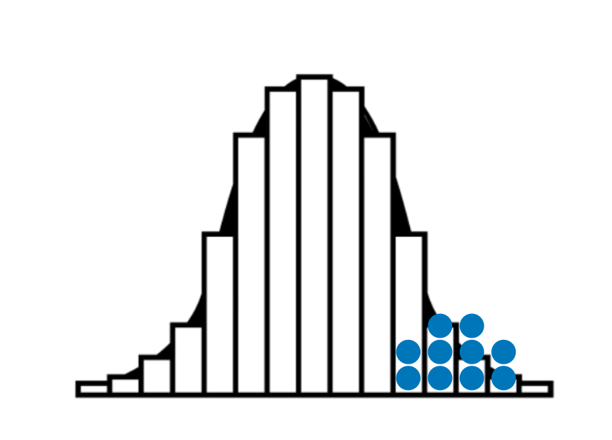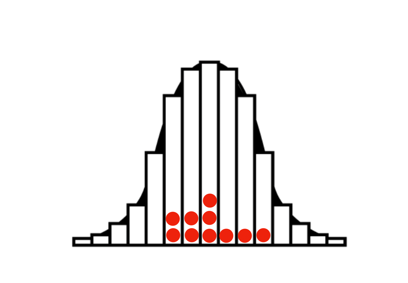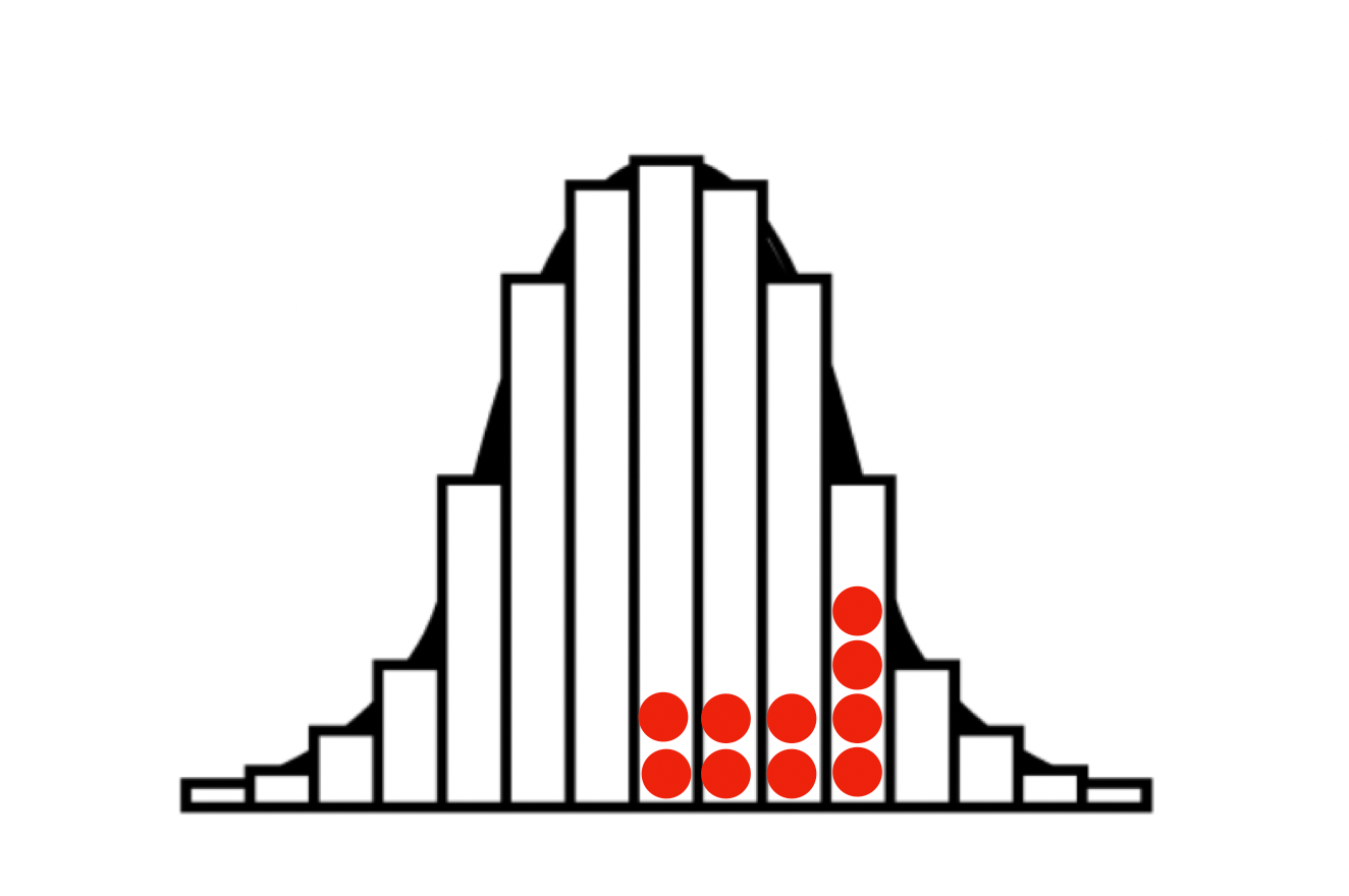 Viele Menschen denken, dass Noten auch einer Normalverteilung entsprechen sollten. Das hängt mit der Vorstellung zusammen, dass Noten als Messwerte betrachtet werden (was sie meiner Ansicht nach nicht sind). Daraus resultiert dann die Vorstellung, dass Noten ungefähr so aussehen sollten (ich gehe von einer Klasse mit 10 Schüler:innen aus, die roten Punkte sind ihre Noten):